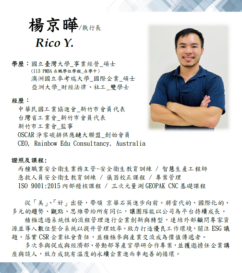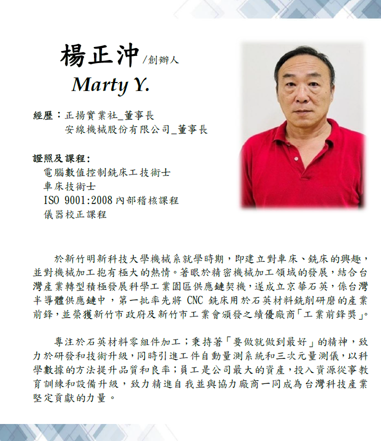 重視傳承精神與人文價值,第一代事業啟蒙先驅 楊煊榮先生早先以安線企業社起家,爾後隨著台灣製造產業的發展及半導體業、光電業的崛起,由第二代 楊正沖創辦人進入石英加工產業,於2004年成立京華石英科技有限公司,憑藉機械加工的專業技術,研究CNC銑床運用於石英銑削研磨,專注於石英材料加工,供應半導體、光電、太陽能、LED產業。為提供客戶更好的品質與服務陸續購入三次元量測儀器。並通過ISO9001國際品質管理系統認證,驗證本公司於「CNC可加工之零組件研發、製造及代工」領域之專業符合國際標準。今後我們將持續聆聽客戶需求,不斷提升專業技術及創新研發,打造邁向卓越的永續企業。
